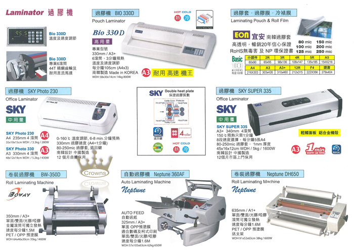 過膠機, 多種品牌以供選擇Bio, SKY, EON, Noway, Neptune, 3M 等.
